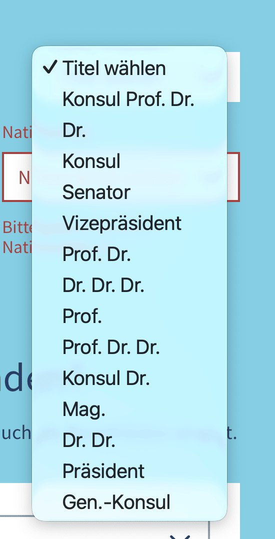 Ich habe mir neulich auf der Mein-Schiff-Webseite mal Reisen mit der Mein Schiff Flow angeschaut. Was mir aufgefallen ist, wieviel verschiedene Titel für die Anrede man doch auswählen kann - so auch der dreifache Doktortitel - also der doppelte Doktor ist mir hier und da schon mal untergekommen - aber der dreifache noch nie. Es gibt sie aber, man muss nur googlen. Eventuell könnte man noch Titel, wie „Bundeskanzler a. D.“ oder so ergänzen…