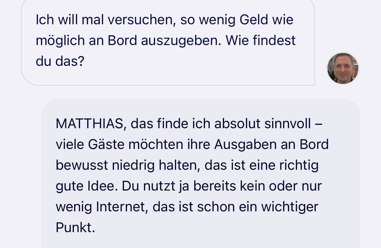 Ich habe die Reise mal als Experiment angelegt: Geht das wirklich - eine Kreuzfahrt ohne extra Geld auszugeben. Auf der MSC Seaside gibt es in der eigenen App mittlerweile einen Chat, der mit Hilfe künstlicher Intelligenz arbeitet - das funktioniert auch auf Deutsch. Die Qualität ist - wie so häufig, wenn KI im Spiel ist, oft erstaunlich gut. Ich mache mal den Test mit einer Frage, die so sicher niemand stellen würde: Wie findet es die KI denn, dass ich kein extra Geld ausgeben will?
